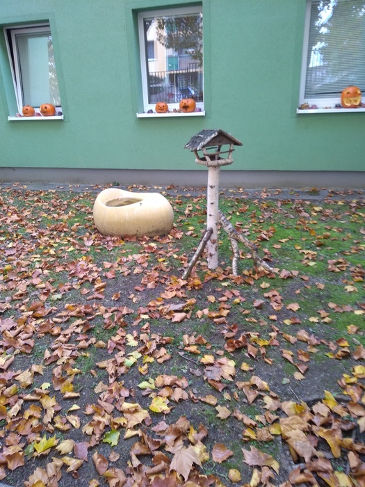Modrá třída, zelená, žlutá nemá místo pro své obrázky. Rozbité krmítko v atriu. Přerostlé větve u smrku na zahradě. Velká přerostlá levandule v keramickém truhlíku u růžové třídy.